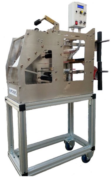 M SN - Полу-автоматична машина за самозалепващи етикети (преден и заден етикет) върху цилиндрични бутилки с диаметър от 20 до 180 мм (коничност по-малка от 4˚). Максимална височина на етикетите: 160 мм. Двата етикета трябва да са поставени върху ДВЕ ленти на разстояние 2-3 мм. Машината е изработена от неръждаема стомана, с опростена и прецизна работа; има вграден функционален микропроцесорен контрол и е поставена на количка за лесно придвижване. Като се сложи бутилката/контейнерът върху валците, машината автоматично поставя етикета върху бутилката/контейнера. Благодарение на дисплея, операторът може лесно да вкара Диаметъра на бутилките, както и широчината на предния и задния етикет; микроконтролера центрира автоматично поставянето на втория етикет. Машината е оборудвана с мултифункционален дисплей с автоматична броячна система. По заявка, машината може да се оборудва с фотоклетка (за по-добро центриране при прилагане на заден етикет върху бутилки с вече залепен преден етикет) и термо-трансферен маркер за принтиране на партида, дата на производство, годност (2 реда, 30 букви).
