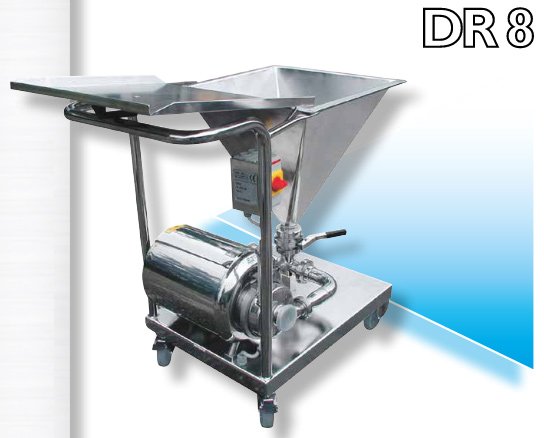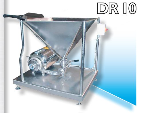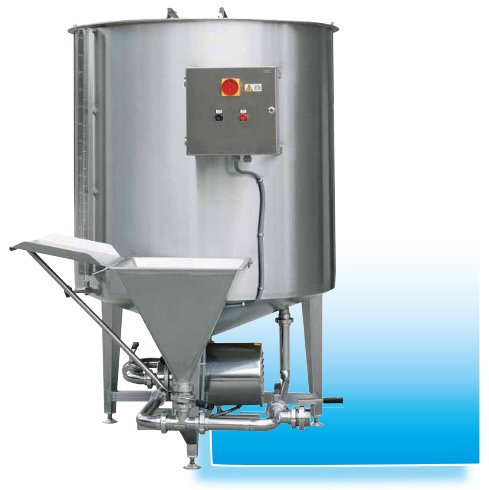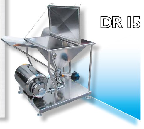 Оборудване за смесване на големи количества прахообразен или във вид на кристали продукт, като се използва пряко вертикално пълнене на продукта и се комбинира с тангенциално вливане на разтварящата течност за пряко смесване на входа на помпата. Продуктът се смесва чрез центробежни сили и след това преминава през специален вал и в резултат на това се получава максимално хомогенизиране на продукта и пълна липса на бучки. Твърди продукти като захар, сол, скорбяла/нишесте, пектин, казеин и други, напълно се разтварят и получения краен продукт е с минимален вискозитет и максимална хомогенност, което спомага да не се образува утаяване и запушване на филтрите, ако се използват такива. Съоръженията могат да се инсталират в линия за непрекъснато производство. Разтварящата течност може да се доставя по 2 метода: със захранваща помпа (А) или направо от резервоар (С), ако той е инсталиран близо до смесителя. Близкото разстояние се изисква, за да се намали съпротивлението на потока, захранващ смесителя. Гравитацията спомага втичането на течността от резервоара, за да се избегне използването на помпа.