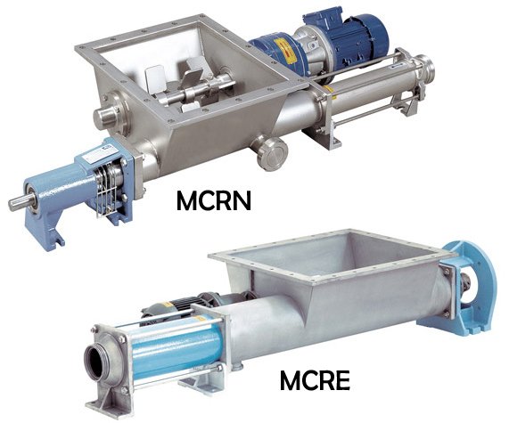 Тези помпи са снабдени с бункер/кош и захранващ винт и допълнително витло с перки, които спомагат по-вискозните продукти да се придвижат в захранващата тръба. Витлото с перките има свой самостоятелен двигател и вариаторно скоростно устройство и намачква продукта, който се изпомпва и го подава към захранващия винт.