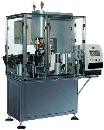 С тази машина могат да се залепват бандероли на различни кръгли бутилки, както при горните 2 вида, но тук, с помощта на допълнителна приставка, могат да се залепва бандероли и върху правоъгълни бутилки. Машината е снабдена с устройство за топло залепване с пистолет и декодер за автоматично регулиране времето за впръскване на лепилото. Машината е снабдена с автоматично устройство за регулиране на височината на бутилките от 180 до 380 мм. Има и устройство за автоматично спиране на машината при блокиране на бутилките. Машината е снабдена със скоростен редуктор. Сгъстеният въздух, с който работи машината, трябва да бъде min. 5 Atm (консумация 200 л/минута).