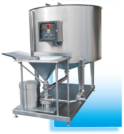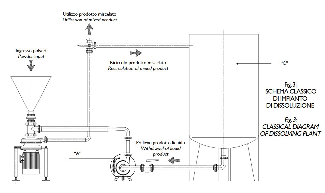 Оборудване за смесване на големи количества прахообразен или във вид на кристали продукт, като се използва пряко вертикално пълнене на продукта и се комбинира с тангенциално вливане на разтварящата течност за пряко смесване на входа на помпата. Продуктът се смесва чрез центробежни сили и след това преминава през специален вал и в резултат на това се получава максимално хомогенизиране на продукта и пълна липса на бучки. Твърди продукти като захар, сол, скорбяла/нишесте, пектин, казеин и други, напълно се разтварят и получения краен продукт е с минимален вискозитет и максимална хомогенност, което спомага да не се образува утаяване и запушване на филтрите, ако се използват такива. Съоръженията могат да се инсталират в линия за непрекъснато производство. Разтварящата течност може да се доставя по 2 метода: със захранваща помпа (А) или направо от резервоар (С), ако той е инсталиран близо до смесителя. Близкото разстояние се изисква, за да се намали съпротивлението на потока, захранващ смесителя. Гравитацията спомага втичането на течността от резервоара, за да се избегне използването на помпа.